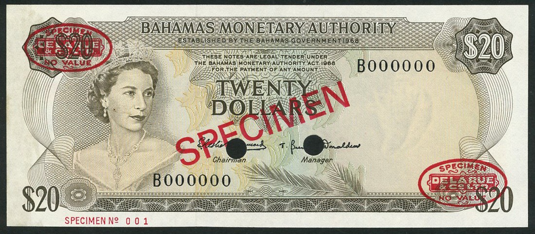 (x) Bahamas Monetary Authority, specimen $20, ND (1968), serial number B 000000, brown and pale blue and orange-brown, Elizabeth II at left, Hammond and Donaldson signatures