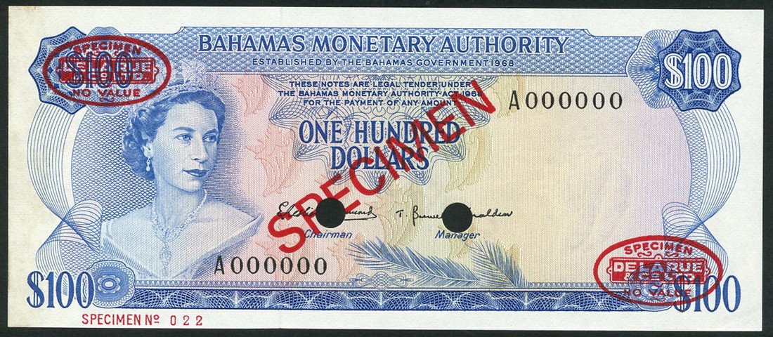 (x) Bahamas Monetary Authority, specimen $100, ND (1968), serial number A 000000, blue and pale pink and orange, Elizabeth II at left, Francis and Donaldson signatures