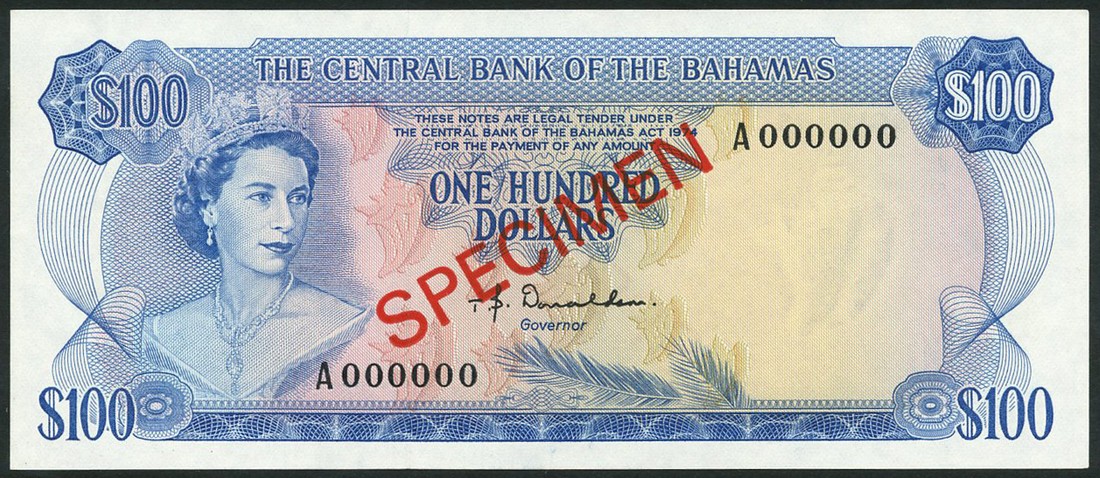 (x) Central Bank of the Bahamas, a specimen set of the ND (1974) series comprising $1, green, $5, orange, $10, black, $20, brown, $50, light brown and $100, blue, all law of 1974, all Elizabeth II at left, Donaldson signature