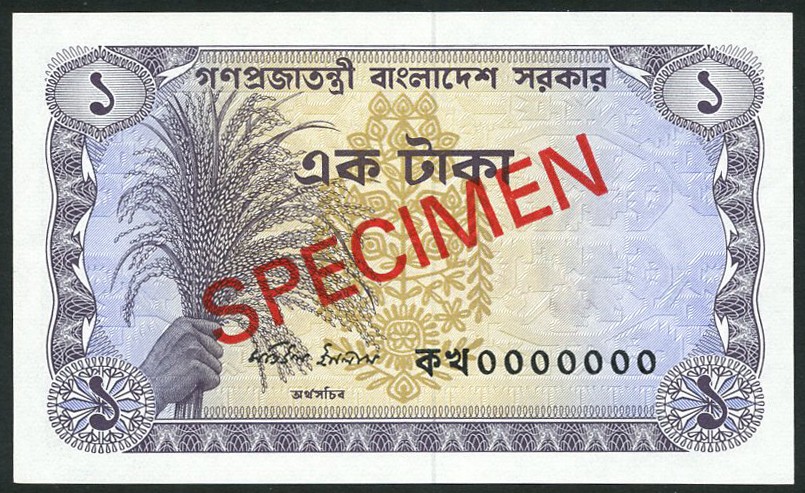 (†) Peoples Republic of Bangladesh, specimen 1 Taka (2), ND (1973), serial number 0000000, one copy with watermark tiger's head, the other without watermark, purple and ochre, hand holding rice plants at left, reverse arms, both overprinted SPECIMEN diagonally in red on obverse and reverse