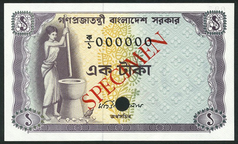 (†) Peoples Republic of Bangladesh, specimen 1 Taka, ND (1973), serial number 0000000, purple on ochre and blue underprint, woman preparing grain at left, reverse rice plants at centre, arms at right; specimen 5 Taka, ND (1981), serial number 000000, brown and multicoloured, archway at right, reverse industrial landscape, both overprinted SPECIMEN diagonally in red on obverse and reverse, one punch hole