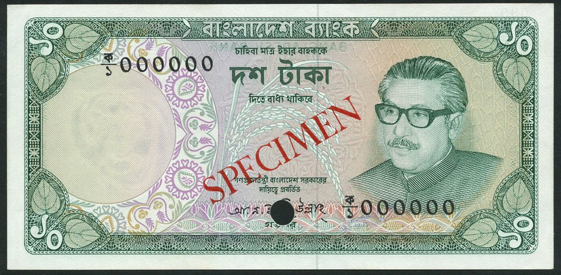 (†) Bangladesh Bank, specimen 5 Taka, ND (1973), serial number 000000, red and multicoloured, Mujibur Rahman at right, reverse industrial estate; 10 Taka, ND (1973), serial number 000000, green and multicoloured, Mujibur Rahman at left, reverse rice harvesting, both overprinted SPECIMEN diagonally in red or black on obverse and reverse, one punch hole