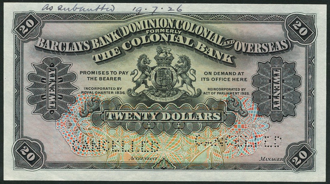 (†) Barclays Bank (Dominion, Colonial and Overseas), specimen proof $20 (2), ND (1926), no serial numbers, no country letters, black on multicoloured underprint, crowned arms at centre, value in guilloches at either side and in each corner, reverse of first copy black, yellow-green and pale blue, reverse of second copy black, pale green and a darker shade of blue, crowned arms in ornate guilloche, perforated CANCELLED twice