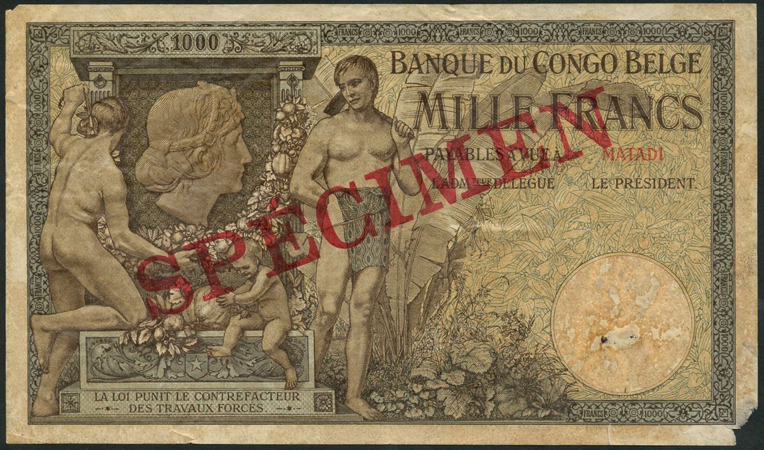 Banque du Congo-Belge, specimen 1000 francs, Matadi, ND (1920), brown and green, allegorical figures and background of plants, medallic female head top left, reverse blue-green and brown, maiden seated at left with lyre, falls and cockatoo at right, border of fruit, reverse