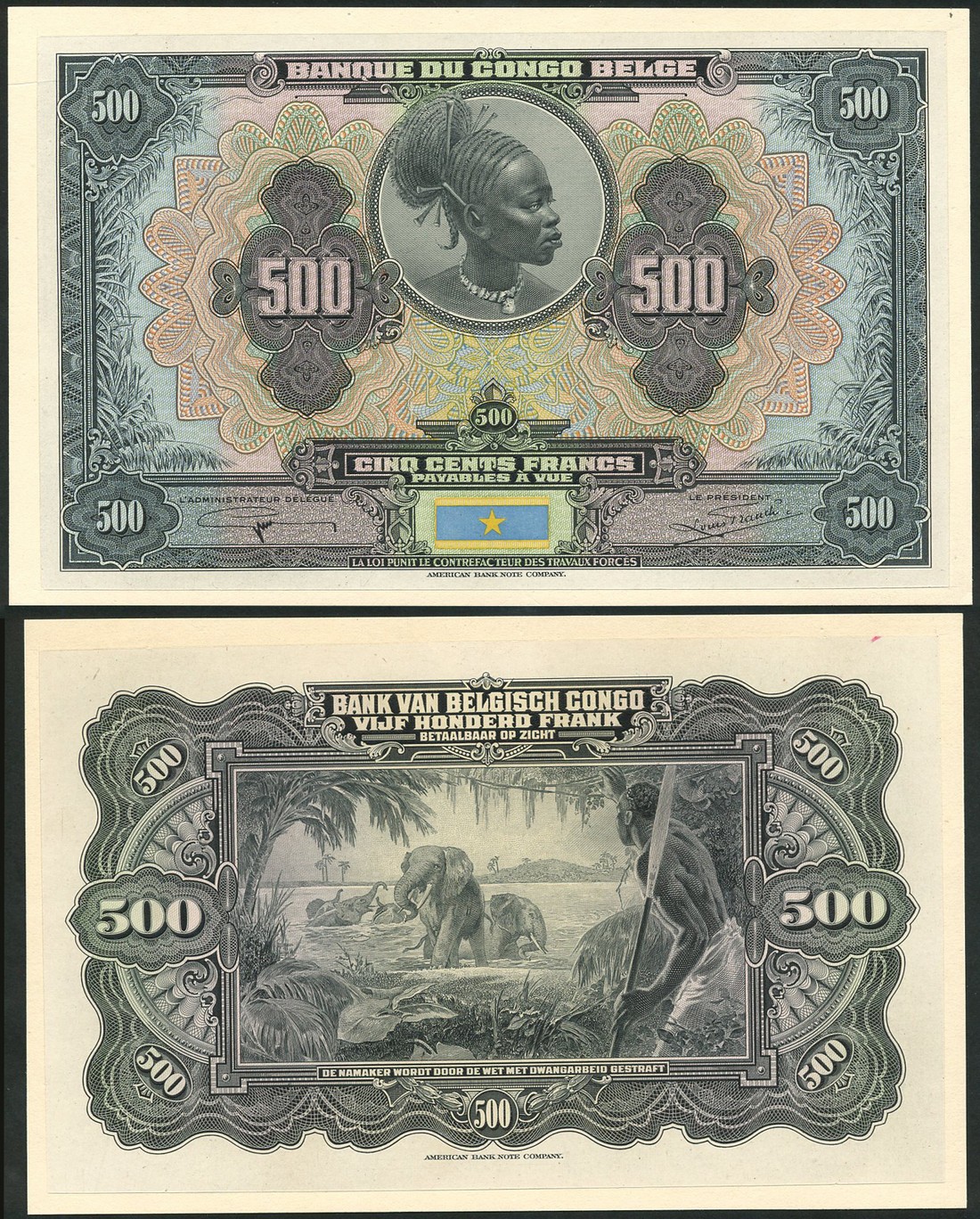 Banque du Congo-Belge, an obverse and reverse uniface colour trial proof 500 francs, ND (1941), black and multicoloured, woman top centre in circular frame, value at left and right, star low centre, reverse black, elephants, river and hunter, value at left and right