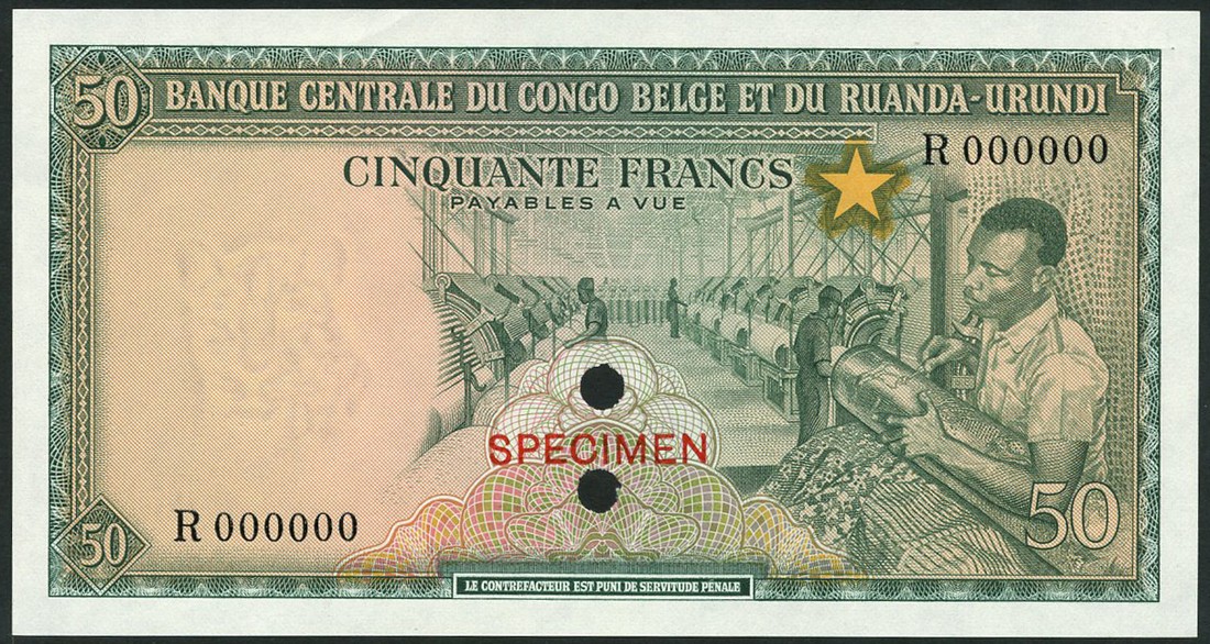 (†) Banque Centrale du Congo-Belge et du Ruanda-Urundi, specimen colour trial 50 Francs (2), ND (1957-59), serial numbers N000000, R000000, green on multicoloured underprint, workers weaving with machines, reverse workers weaving by hand, both overprinted SPECIMEN horizontally in red on obverse and reverse, two punch holes
