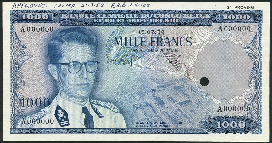 (†) Banque Centrale du Congo-Belge et du Ruanda-Urundi, specimen proof 1000 Francs, 15 July 1958, serial number A000000, deep blue on multicoloured underprint, portrait of King Baudouin at left, aerial view of Leopoldville at lower centre, reverse huts and palm trees set in geometric pattern, one punch hole