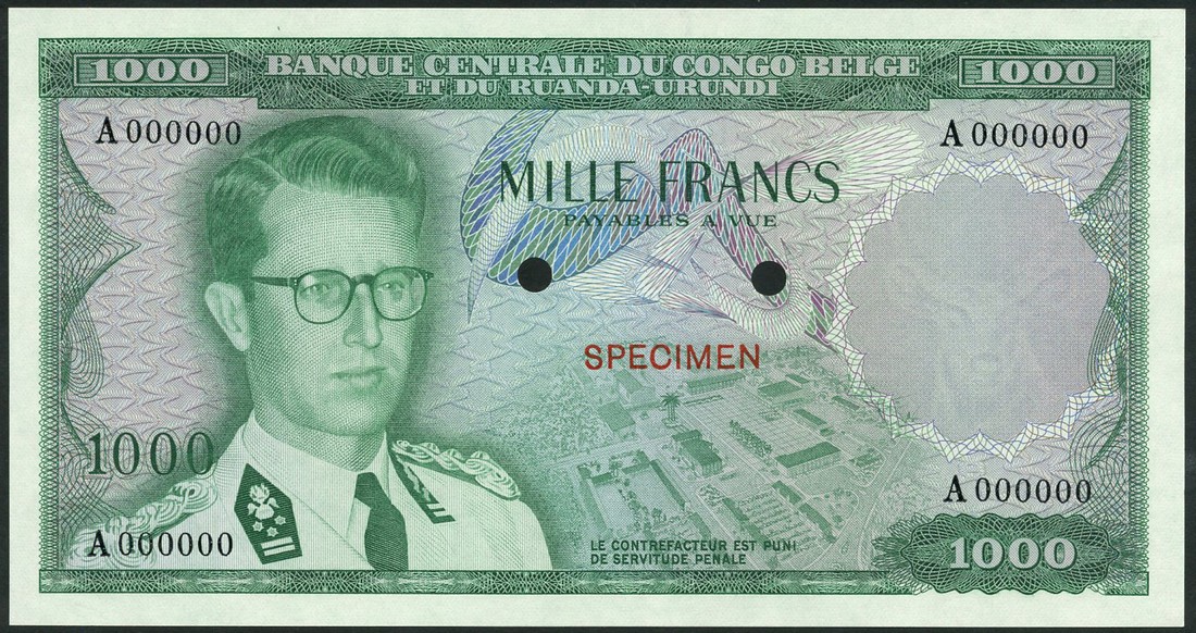 (†) Banque Centrale du Congo-Belge et du Ruanda-Urundi, specimen colour trial 1000 Francs, ND (c. 1958), serial number A000000, green on multicoloured underprint, portrait of King Baudouin at left, aerial view of Leopoldville at lower centre, reverse huts and palm trees set in geometric pattern, overprinted SPECIMEN horizontally in red on obverse and reverse, two punch holes