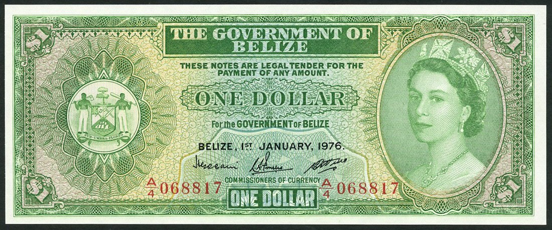 (x) Government of Belize, $1 (2), 1 January 1976, consecutive serial numbers A/4068817/8, green on multicolour underprint, Queen Elizabeth II at right, arms at left,