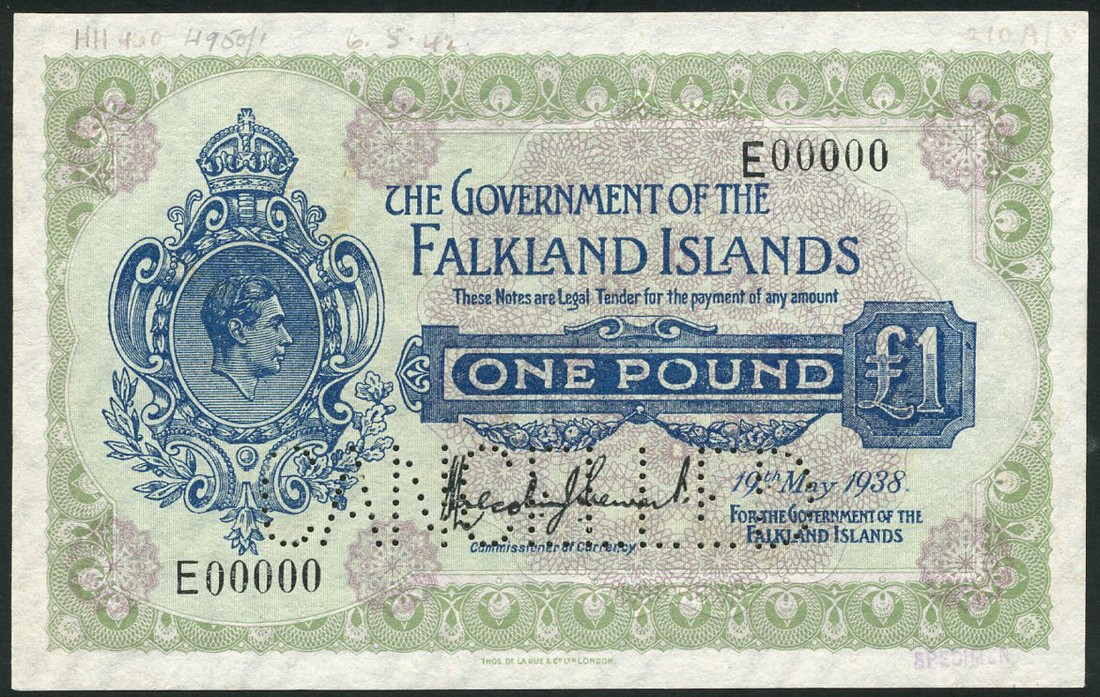 (x) Government of the Falkland Islands, specimen £1, 19 May 1948, serial number E 00000, blue, green and lilac, George VI at left, reverse blue