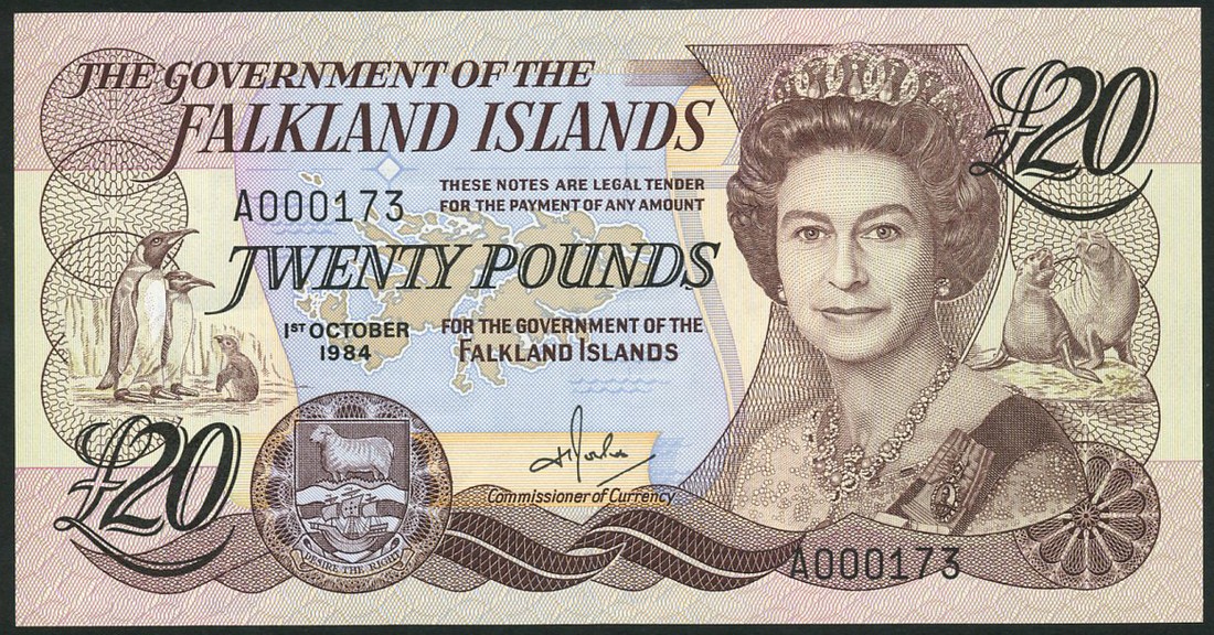 Government of the Falkland Islands, £1, 1 October 1984, serial number A001241, blue and multicolour, £10, 1 September 1986, serial number A000911, green and multicolour, £20, 1 October 1984, serial number A000173, brown and multicolour, all Queen Elizabeth II at right, penguins at left and sea lions far left