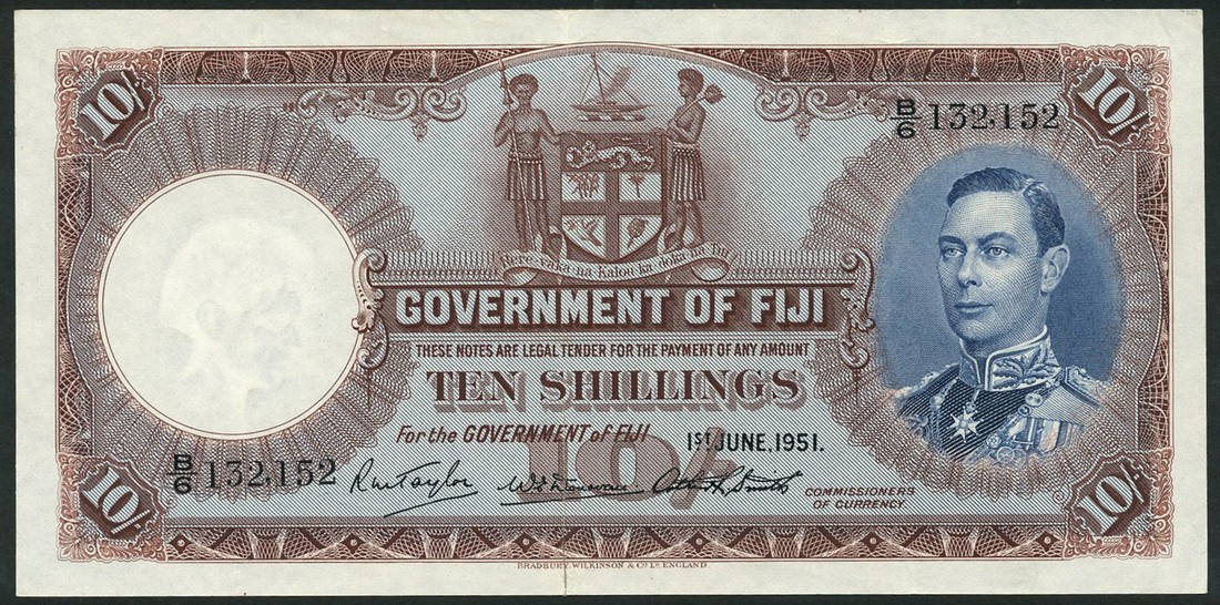 (x) Government of Fiji, 10 shillings, 1 June 1951, serial number B/6 132,152, brown on light blue, King George VI at right, arms top centre,