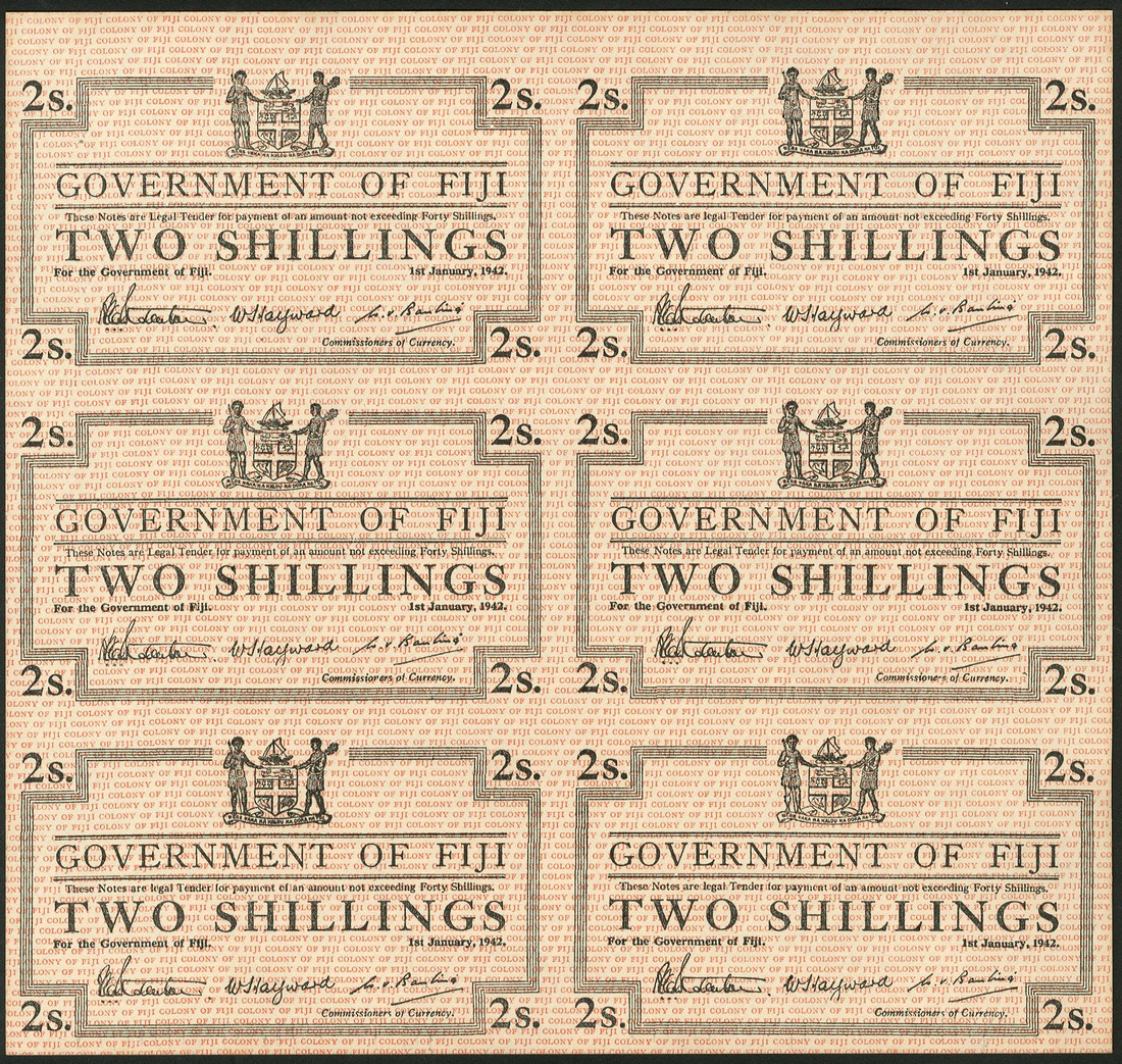 Government of Fiji, one sheet containing 6 unissued 2 shillings, 1 January 1942, black text on pink paper, arms top centre