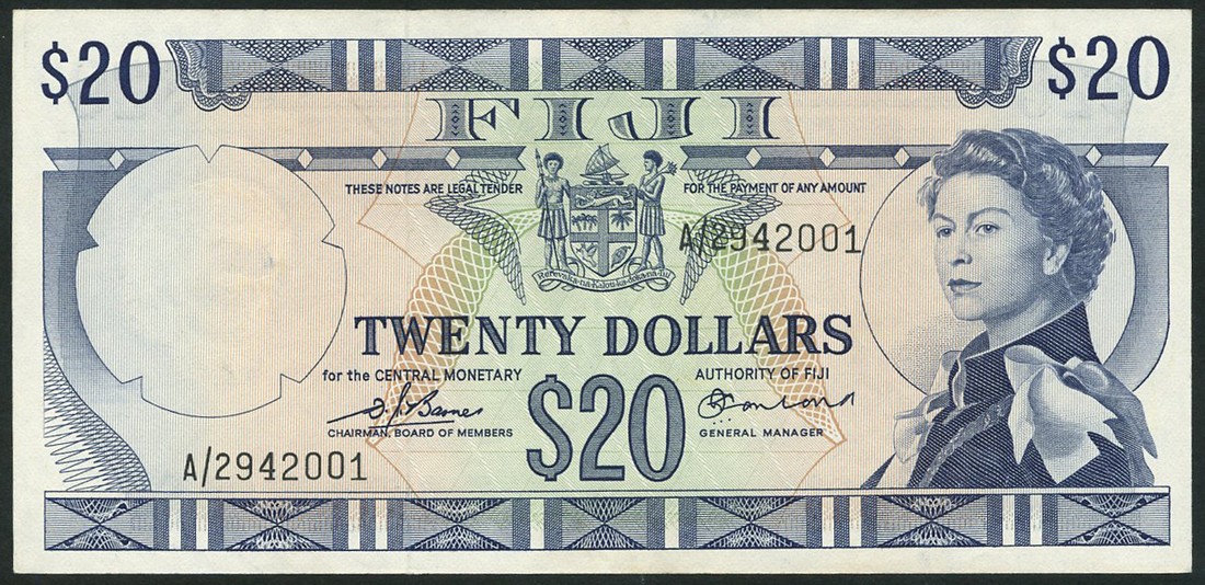 (x) Central Monetary Authority, Fiji, $10, ND (1974), serial number A/2 039600, signatures Barnes and Craik, purple and multicoloured; $20, ND (1974), serial number A/2 942001, signatures Barnes and Earland, blue on multicoloured underprint, both Annigoni portrait of Queen Elizabeth II at right, coat of arms at upper centre, value at lower centre, top right and left, reverse ornate geometric patterns