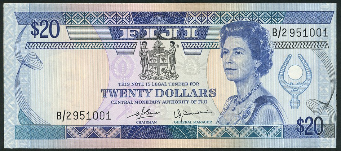 (x) Central Monetary Authority, Fiji $20, ND (1980), serial number B/2 951001, signatures Barnes and Tomkins, blue on multicoloured underprint, portrait of Queen Elizabeth II at centre right, coat of arms at upper centre, domodomo at right, reverse bure kalou with thatched roof at centre left, domodomo at left