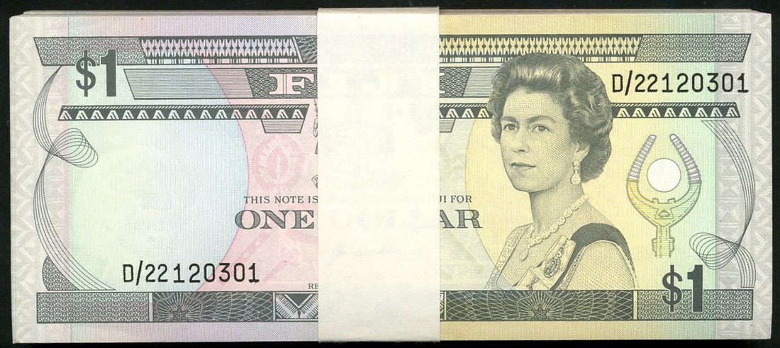 (x) Reserve Bank of Fiji, a block of 100 consecutive $1, ND (1993), serial number D 22120301/22120400, grey-green and pink, Elizabeth II at right, arms at centre, Kubuabola signature