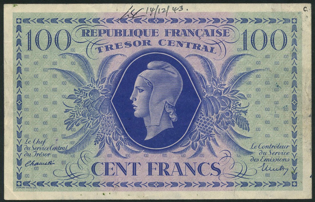 (†) Tresor Central, France specimen 100 Francs, Law of 2 October 1943, no serial numbers, blue on green and violet underprint, portrait of Marianne at centre, value at upper left and right, reverse anchor, barrel, bale and other implements