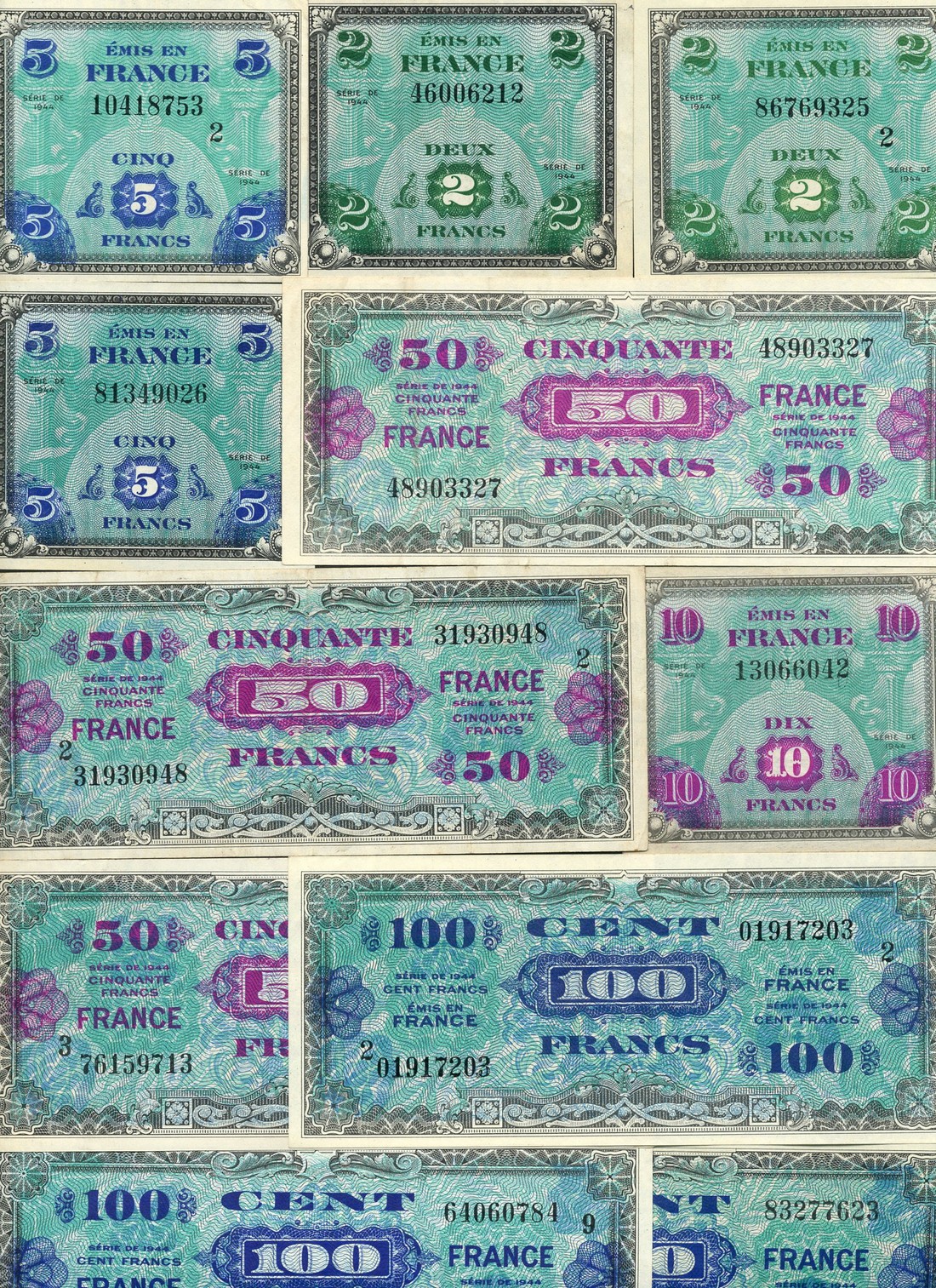 Allied Military Currency, France a quality selection comprising 2 francs (2) 5 francs (2), 10 francs, 50 francs (5), 100 francs (15)