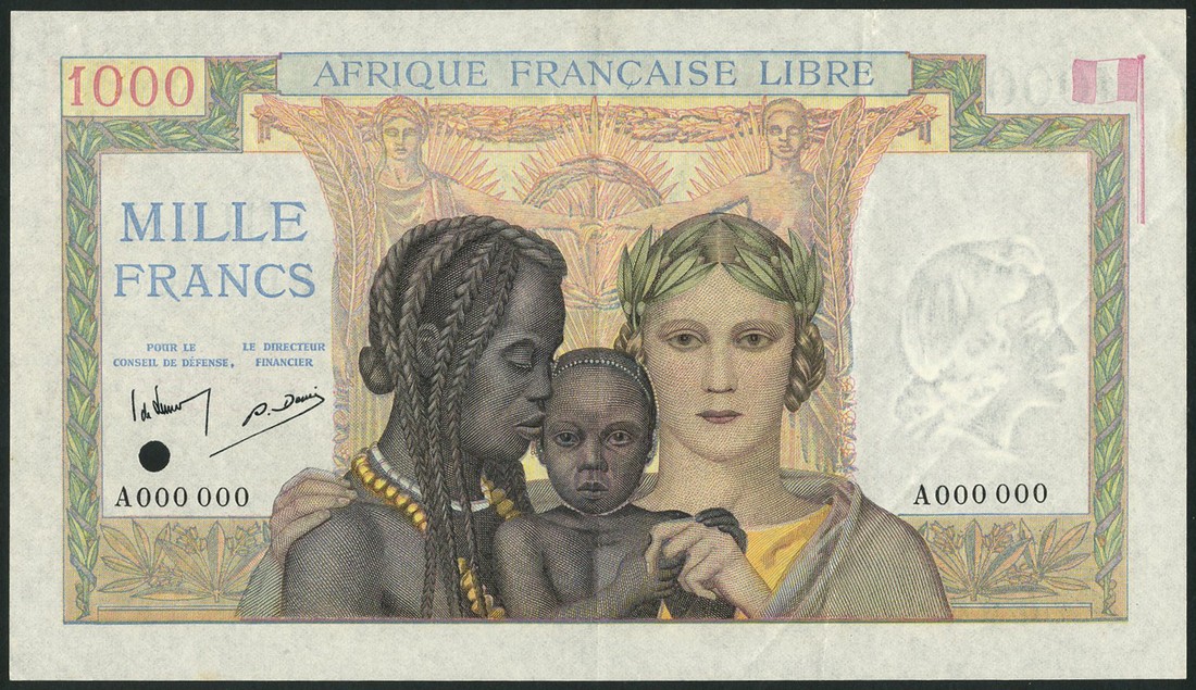 Afrique Francais Libre, French Equatorial Africa, specimen 1000 francs, ND (1941), zero serial numbers, multicoloured, allegorical figures representing France, mother and child, flag top right, value top left, two printed signatures at left