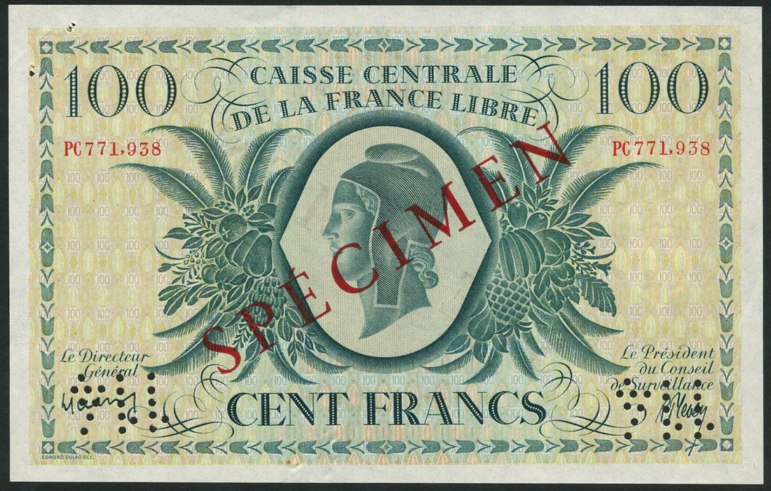 Caisse Centrale de la France Libre, French Equatorial Africa, specimen 100 francs, ND (L 1941), red serial number PC 771,938, green and pale orange, head of Marianne at centre, also Caisse Centrale de la France Libre, Reunion, 100 francs, ND (1945), red serial number PE 759266, green and pale orange-yellow and lilac, head of Marianne at centre