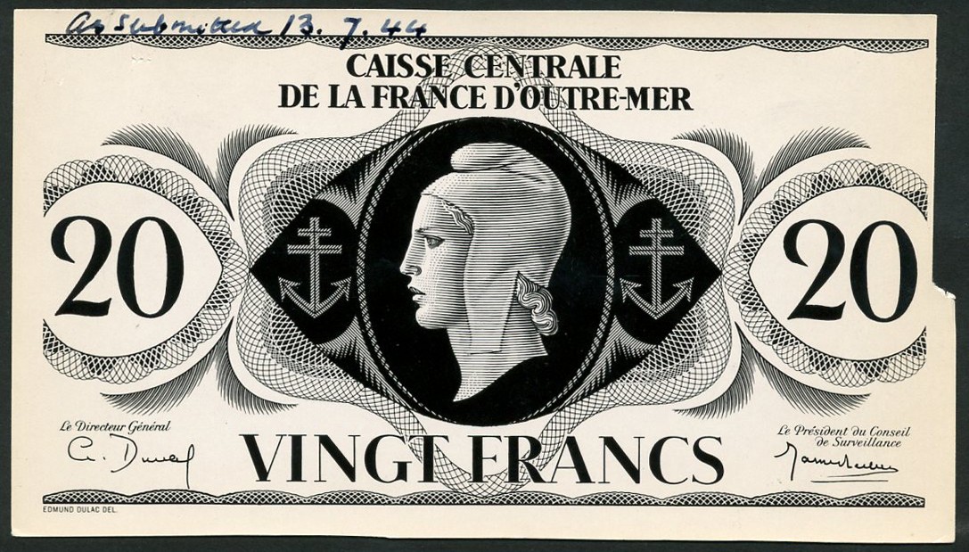 (†) Caisse Centrale de la France d'Outre-Mer, French Equatorial Africa, obverse and reverse photographic style black and white proofs for 5 Francs, 10 Francs and 20 Francs, Law of 2 February 1944, all signature A. Duval, all portrait of Marianne at centre, value at left and right, reverse extract from Penal Code in decorated oval, value on either side