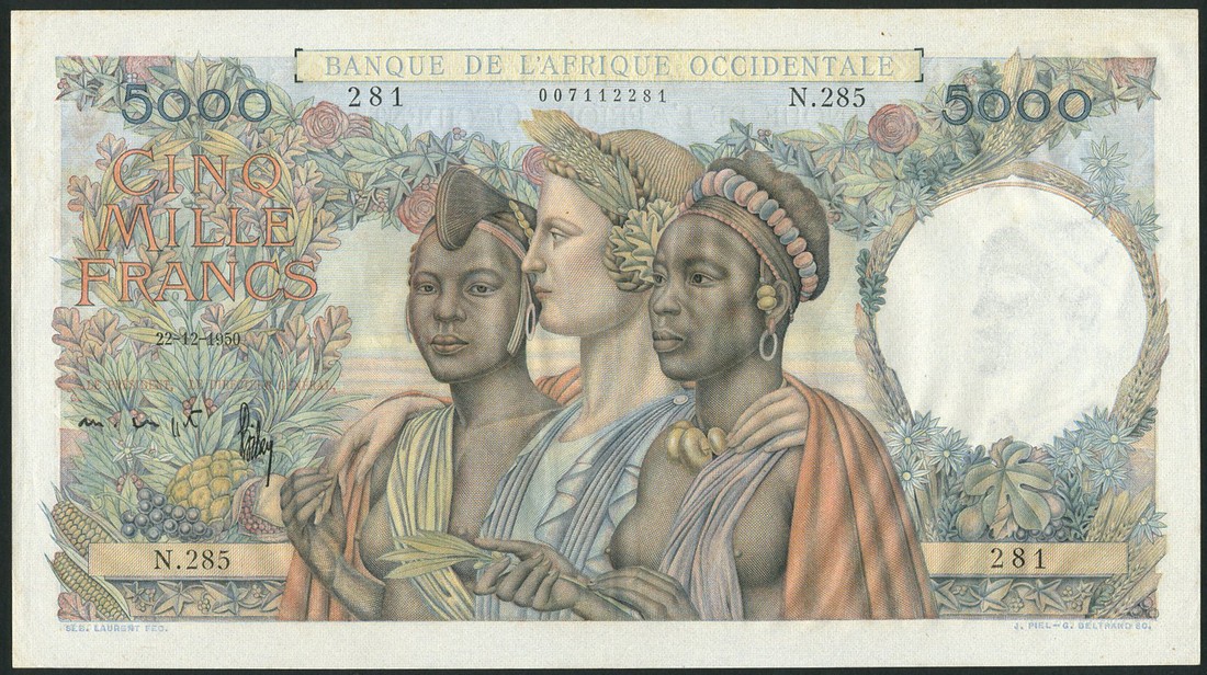 Banque de l'Afrique Occidentale, 25 francs (2), 1942, serial numbers 69743089 and 89526085, blue, red and brown, man and horse at centre, 100 francs, 14 December 1942, blue serial number T437-880, pink and black, Baobab tree at centre, and 5000 francs, 22 December 1950, serial number N 285-281, blue and multicoloured, allegorical figures at centre, France and colonies, flowers and fruit in field