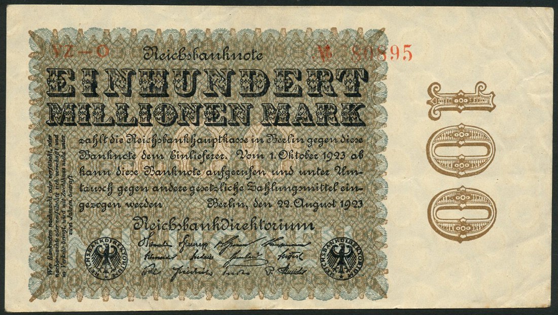 Reichsbanknote, Republic Treasury Notes, Germany, 100 millionen mark (2), 22 August 1923, uniface, black on blue green and olive underprint,