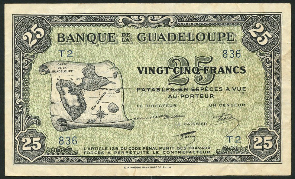 Banque de la Guadeloupe, 5 francs, ND (1945), serial number P22-020, black and orange, Columbus at centre, Boudin signature, reverse maroon, value, 25 francs, ND (1944), serial number T2-836, black and green, map of Guadeloupe at left, Devineau signature, reverse blue, maiden