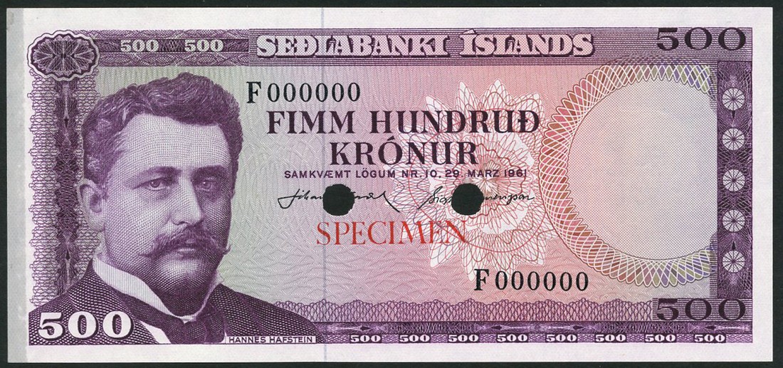 (†) Central Bank of Iceland, specimen colour trial 500 Kronur, Law of 29 March 1961, serial number F000000, signatures Nordal and Kiemenzson, purple on pink and pale green underprint, Hannes Hafstein at left, reverse fishermen in trawler, overprinted SPECIMEN in red on obverse and reverse, two punch holes