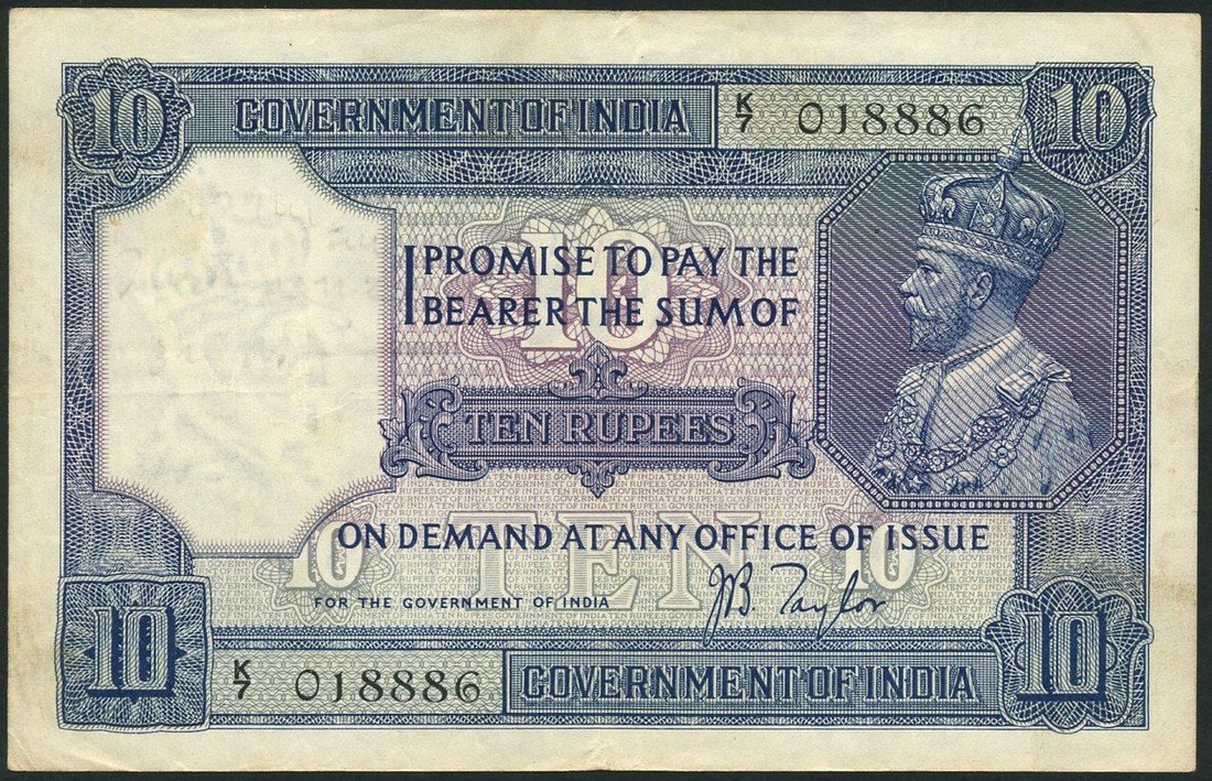 (x) Government of India, 10 rupees, ND (1917-30), serial number K/7 018886, dark blue on purple and green underprint, George V at right, Taylor signature, also Grand Oriental Hotel, Colombo, Ceylon, 10 cents