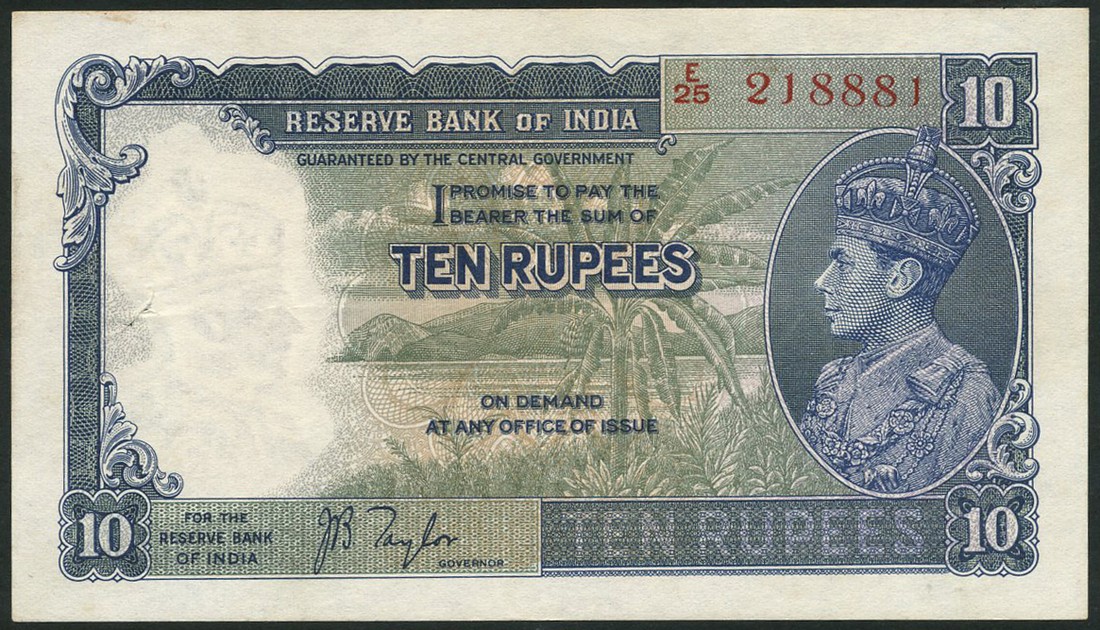 Reserve Bank of India, 2 rupees and 10 rupees, ND (1937), serial numbers F/60 56835 and E/5 218881, first pink on multicolour underprint, Deshmukh signature, second dark blue and olive, Taylor signature, both with George VI at right