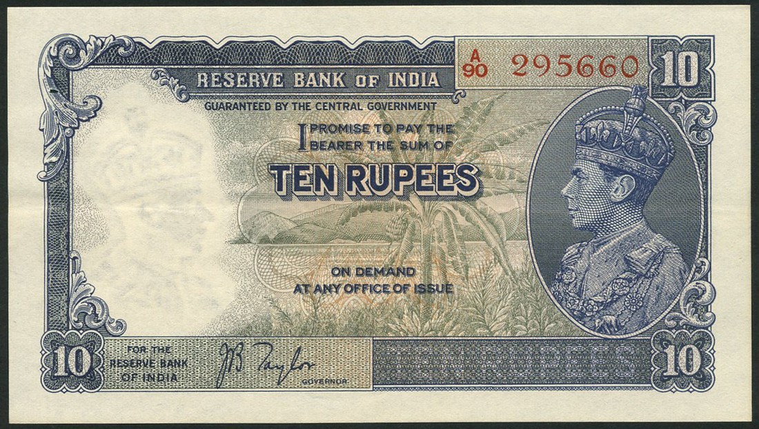 Reserve Bank of India, 10 rupees (2), ND (1937), serial numbers A/90 295660-61, dark blue and olive green, George VI at right, Taylor signature, reverse arms at centre