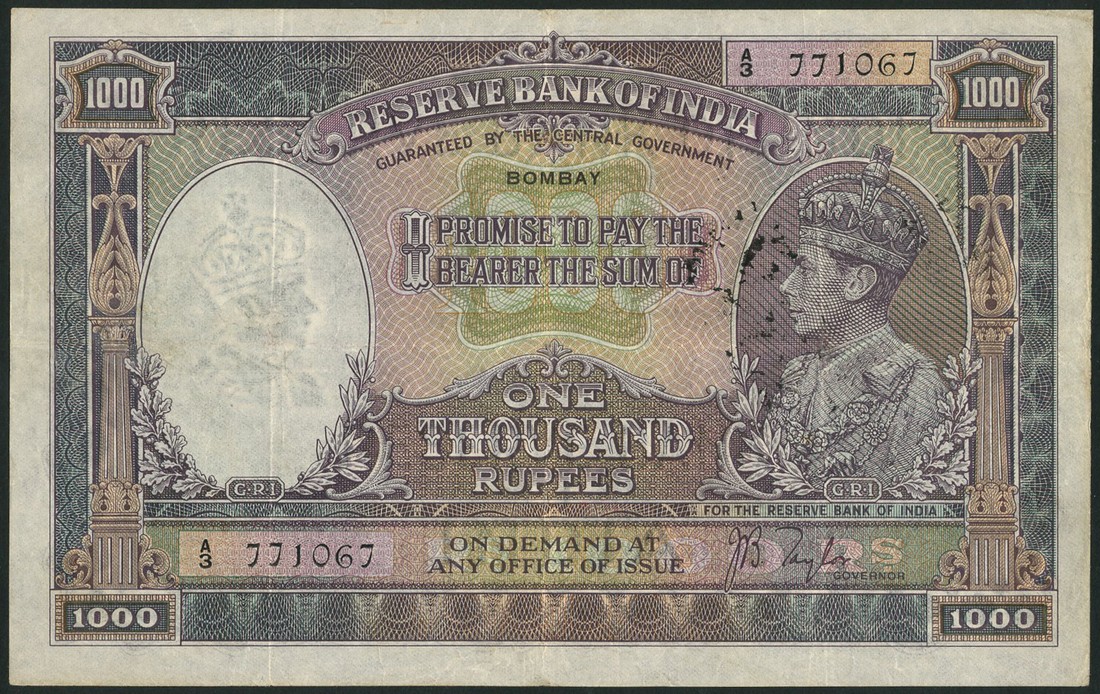 (x) Reserve Bank of India, 1000 rupees, Bombay ND (1937), serial number A3 771067, lilac, violet and green, portrait George V at right, Taylor signature reverse mountain scene at centre, several black overstamps centre left "B-CA" with different dates