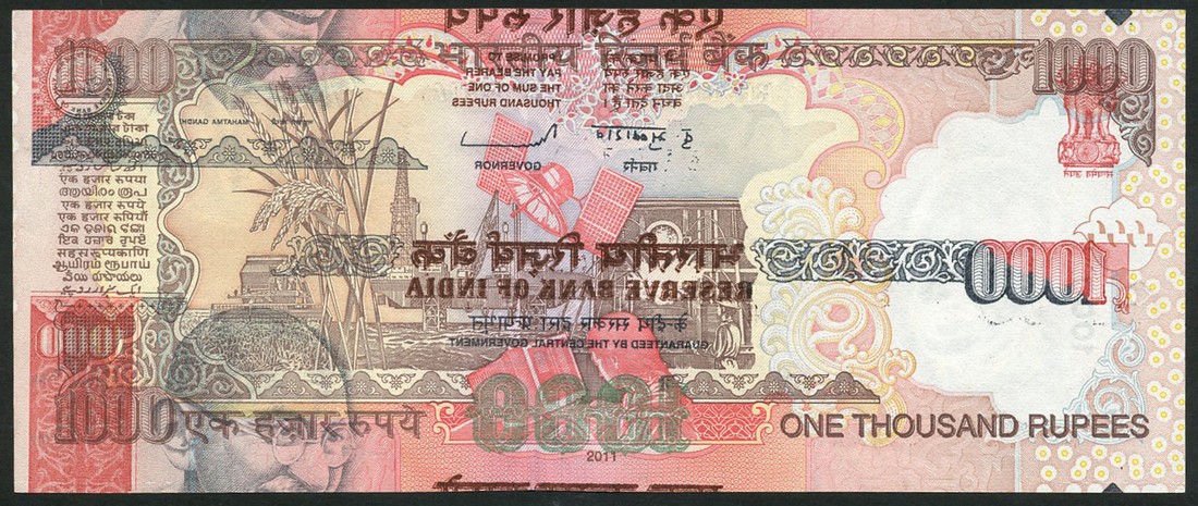 ERROR: Reserve Bank of India, 1000 rupees (2), 2009, serial numbers 9FL 105621 and 9FL 105624, both with spectacular printing errors on reverse, with portions of the obverse inverted and printed on the reverse in addition to the reverse printing