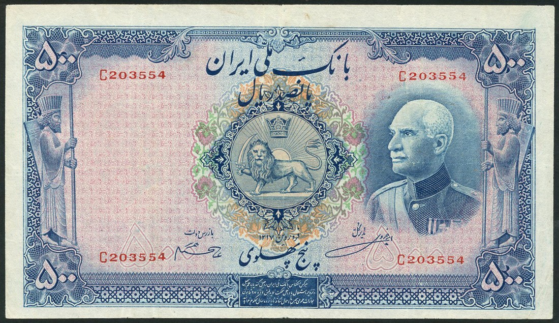 Bank Melli Iran, 500 rials, AH 1319 (1937), red serial number C 203554, blue and multicoloured, Shah Reza at right, arms at centre, Imperial guardsman at left and right, reverse blue, the grave of Cyrus the Great at centre, Persian text