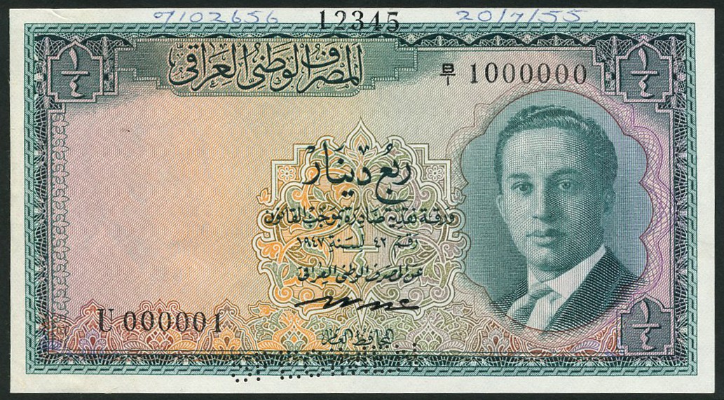 (†) National Bank of Iraq, printer's archival specimen ¼ Dinar, Law of 1947 (1955), serial run U 000001 to B/1 1000000, green on multicoloured underprint, portrait of adolescent King Faisal II at right, reverse palm trees at centre, denomination in decorated circle at left, perforated SPECIMEN
