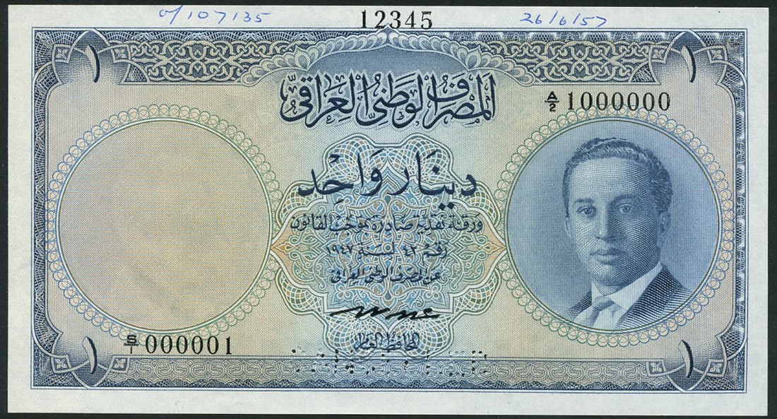 (†) National Bank of Iraq, printer's archival specimen 1 Dinar, Law of 1947 (1955), serial number run S/1 000001 to A/2 1000000, blue on multicoloured underprint, portrait of adolescent King Faisal II at right, reverse equestrian statue of King Faisal I at centre, denomination in ornate pattern at left, watermark large head, perforated CANCELLED