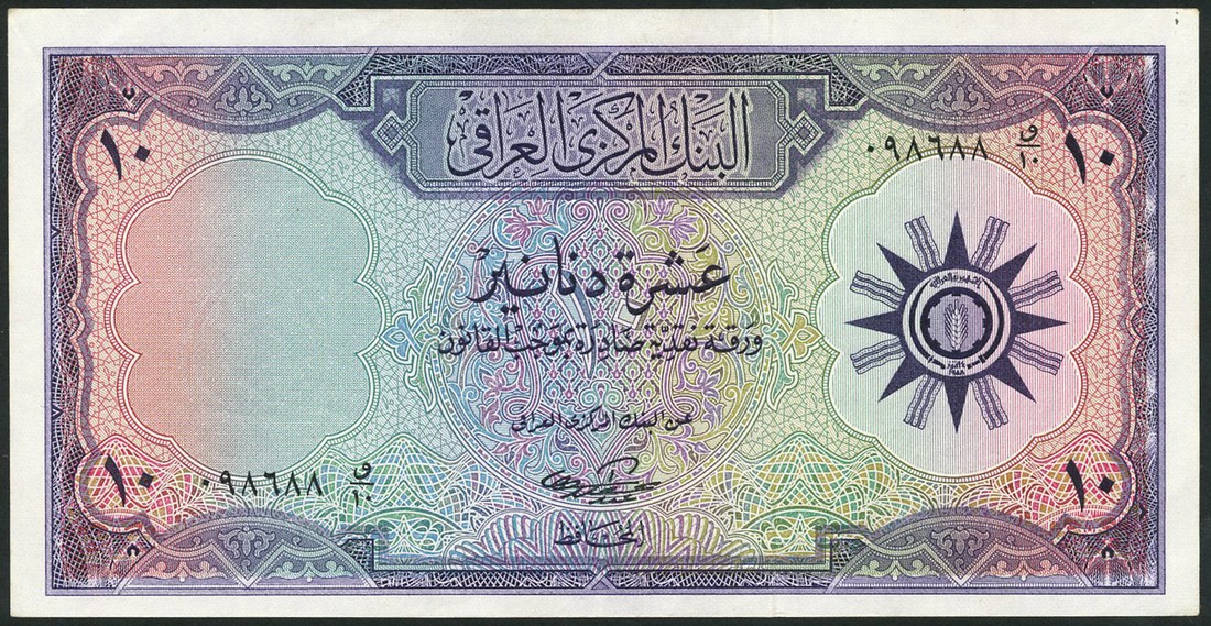 (x) Central Bank of Iraq, a selection comprising 10 dinars, 1958, purple, signature 2 (Pick 55), 1 dinar, ND (1973), (Pick 63b), 25 dinars (2), 1978/1980, green, horses (Pick 66a,66b), 10 dinars, ND (1980), (Pick 71), and 25000 dinars, ND (2003), red