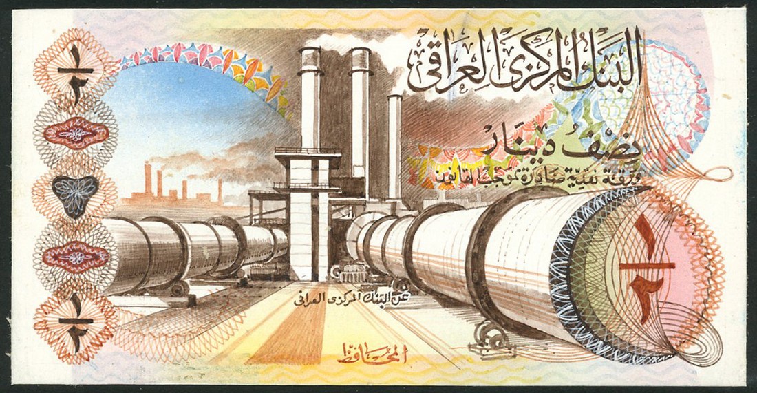 (†) Central Bank of Iraq, an obverse composite essay on card for a ½ Dinar, ND (ca1971), brown and multicoloured, cement factory at centre, value at upper and lower left and in larger format at lower right, linear pattern at right