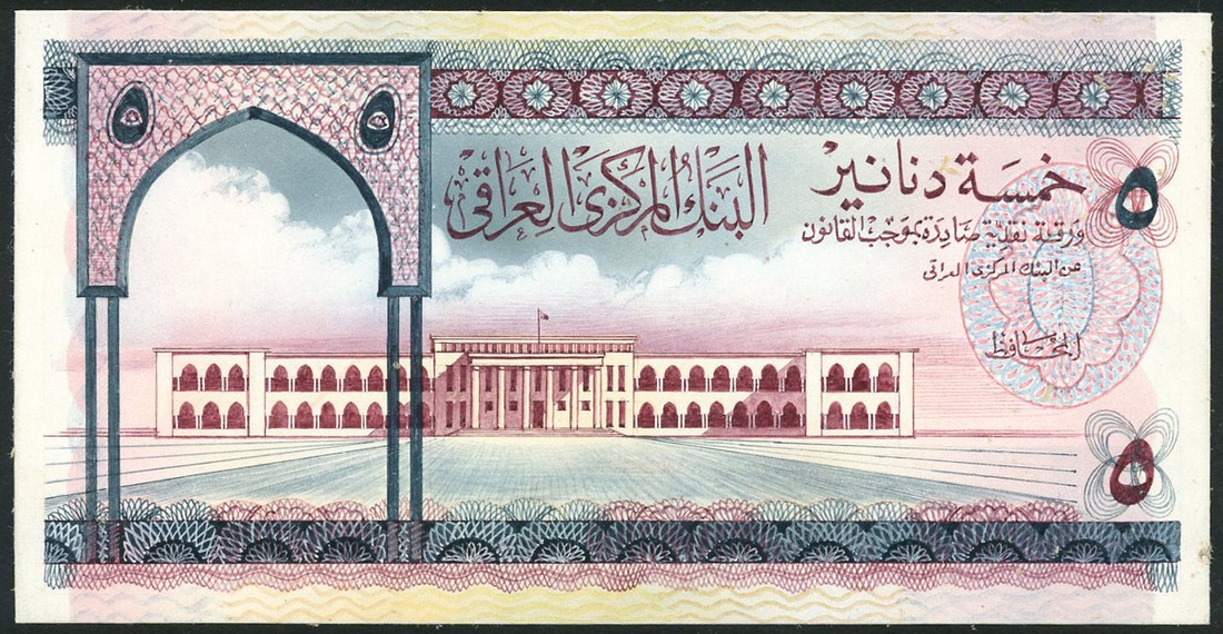 (†) Central Bank of Iraq, an obverse composite essay on card for a 5 Dinars, ND (ca1971), blue and purple, parliament building at centre, ornately decorated archway at left incorporating value at top left and right, also value at upper and lower right