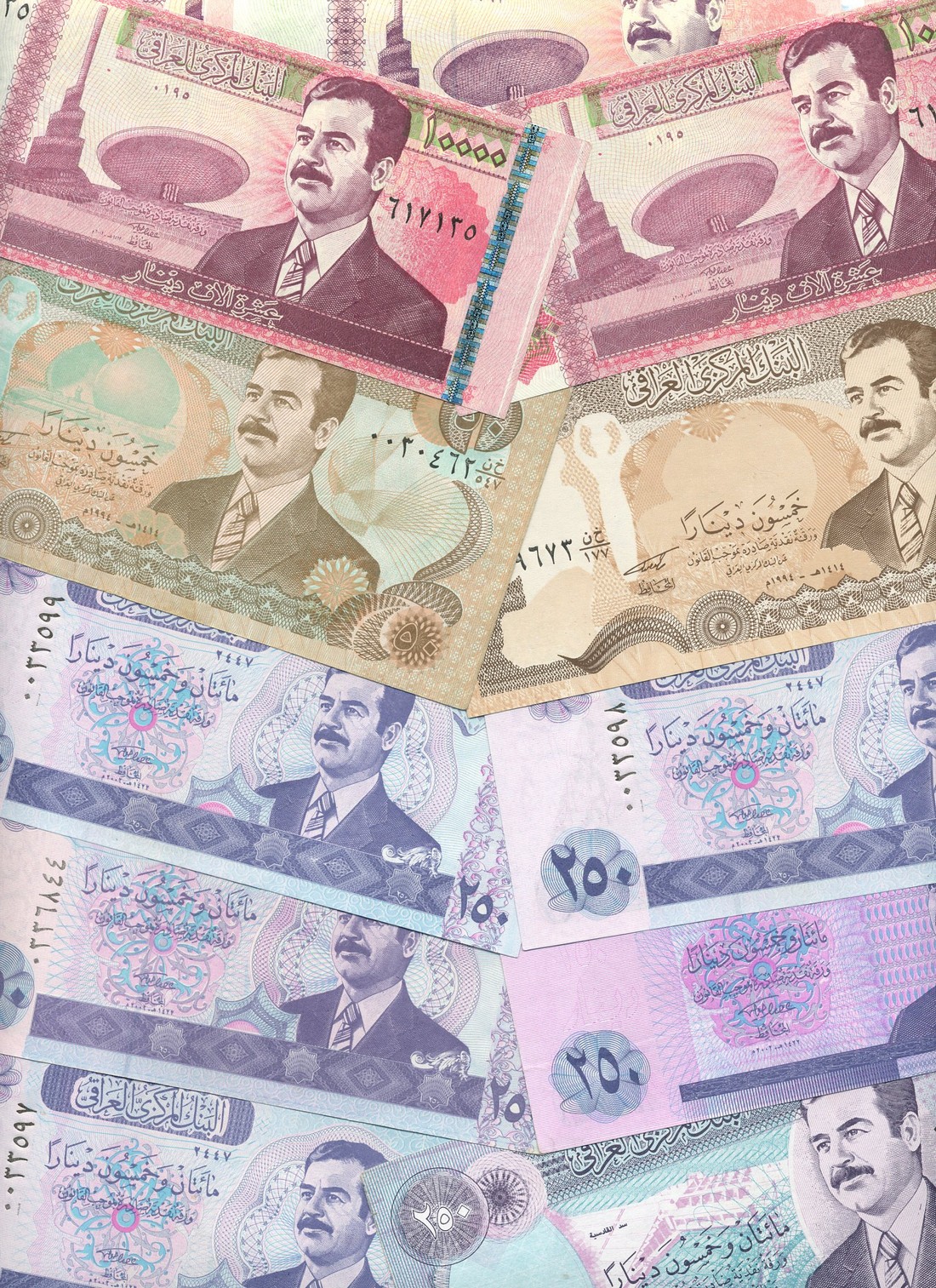 (x) Central Bank of Iraq, a mixed group comprising 50 dinars (2), 250 dinars (10), 10000 (8), includes some unusual errors