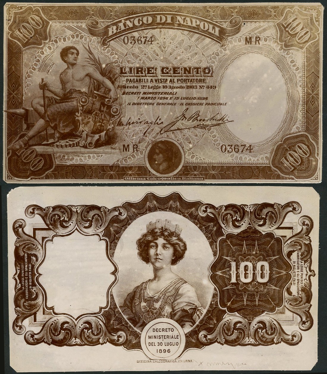 Banco di Napoli, Italy, a printers obverse and reverse archival photograph for a 100 lire, decree of 1896, serial number MR 03674, allegorial male figure at left with arms, hammer and anvil (Hephaestion), laureate head of Italia low centre, value at centre and at each corner, reverse turreted female bust at centre, value at right and seal with text 'DECRETO MINISTERIALE DEL 30 LUGLIO 1896'