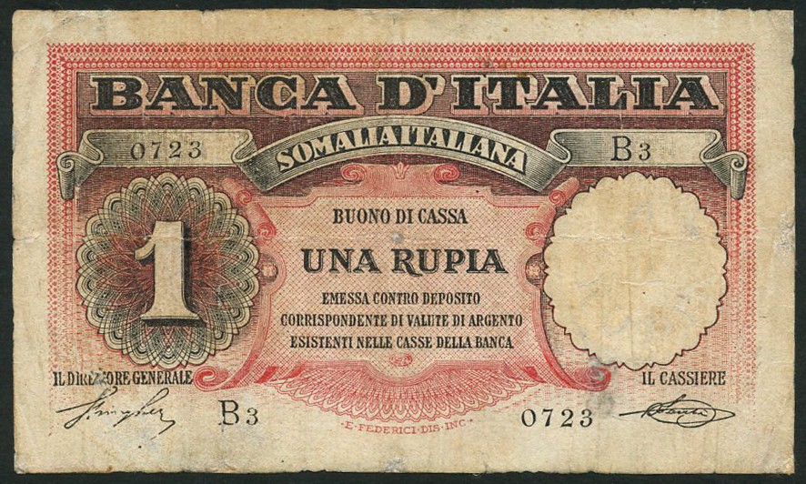 Banca D'Italia, Italian Somaliland, 1 rupia, 1920, serial number B3 0723, black, white and pale pink-red, value at centre and at left, Stringher and Sachi signatures, reverse brown, Arabic text