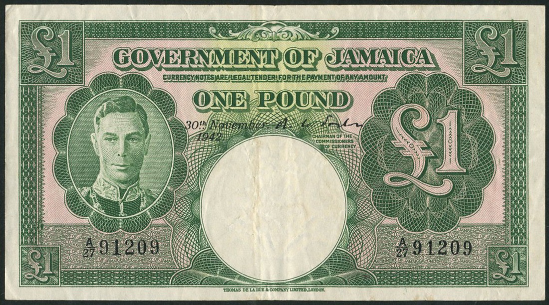 Government of Jamaica, 5 shillings, 1940, serial number C/62 45589, orange-brown, 10 shillings (2), 1 November 1940, serial numbers C/10 54884 and C/40 40305, blue, £1, 1942, serial number A/27 91209, green and pink, all George VI at left, value at right