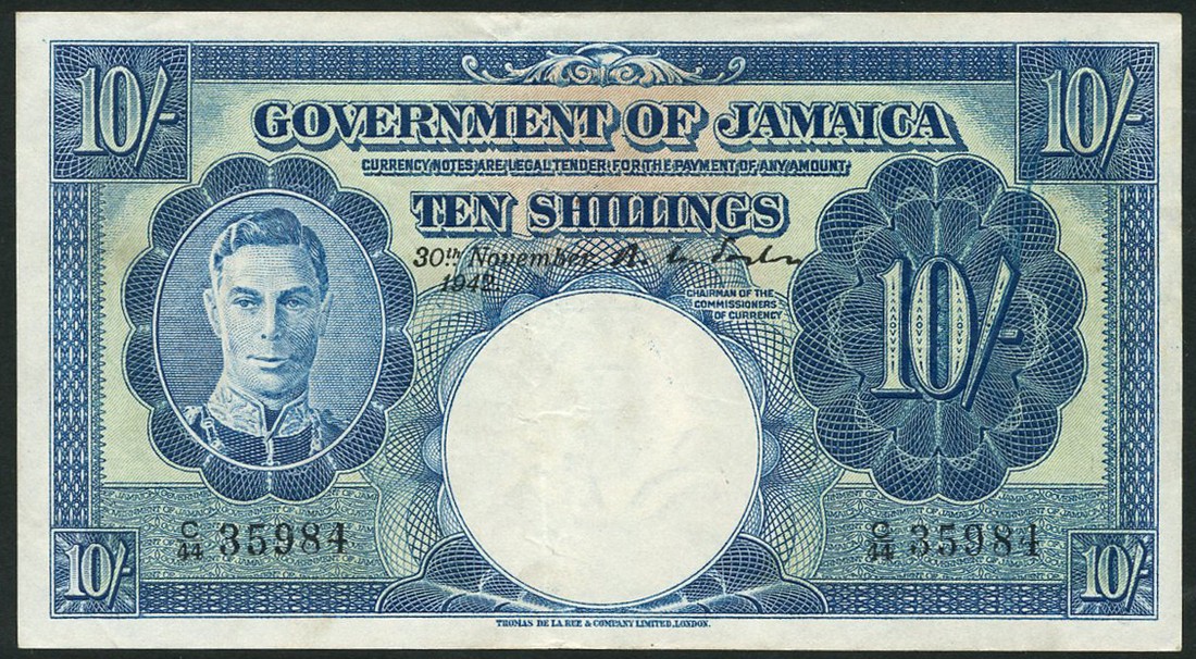 (x) Government of Jamaica, 10 shillings, 30 November 1942, serial number C/44 35984, blue, George VI at left, value at right, reverse blue and pink and pale orange, arms top centre, value at left and right