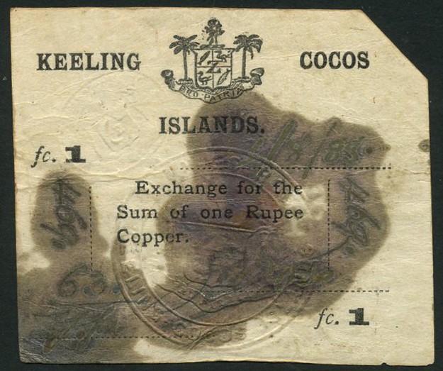 (x) Keeling-Cocos Islands, 1 rupee, 1 August 1888, black text on sheepskin (vellum), manuscript date, serial numbers and signatures, embossed seal at centre