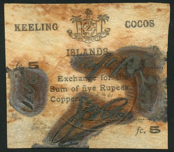 (x) Keeling-Cocos Islands, 5 rupees, 12 January 1888, black text on sheepskin (vellum), manuscript date, serial numbers and signatures, embossed seal at centre