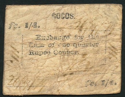 (x) Keeling-Cocos Islands, 1/4 rupee, 26 September 1897, black text on sheepskin (vellum), manuscript date, serial numbers and signatures