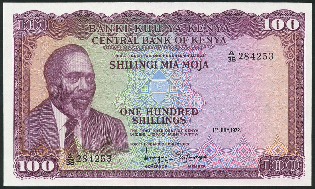 Central Bank of Kenya, a set comprising 5 shillings, 1977, orange, 10 shillings, 1974, green, 20 shillings, 1973, blue, 50 shillings, 1971, black and 100 shillings, 1972, purple, all with Kenyatta at left, value at each corner