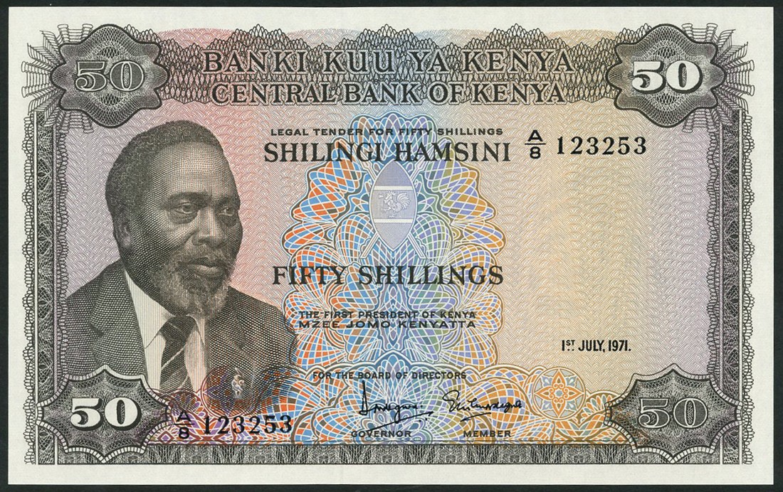 (x) Central Bank of Kenya, 50 Shillings (2), 1 July 1971, consecutive serial numbers A/8 123253/54, signature 3, dark brown on multicoloured underprint, portrait of Mzee Jomo Kenyatta at left, coat of arms at centre, reverse four workers picking cotton, Mount Kenya at upper right